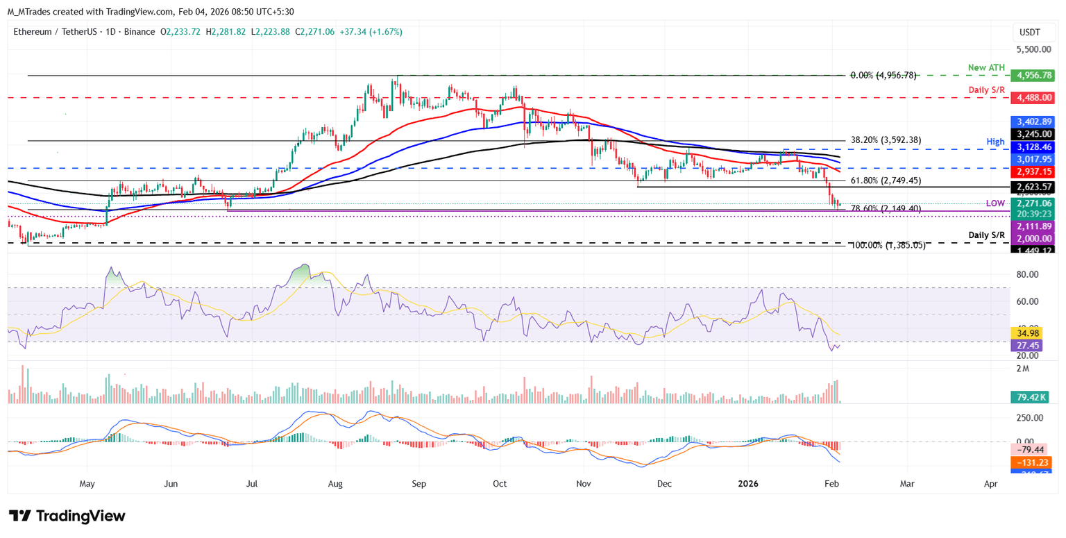 以太坊价格收盘价低于 61.8% 斐波那契回撤位,报 2,749 美元。以太坊价格周五开始下跌,周二跌幅超过17%,触及2110美元的低点。截至周三,以太坊交易价格在2270美元左右。