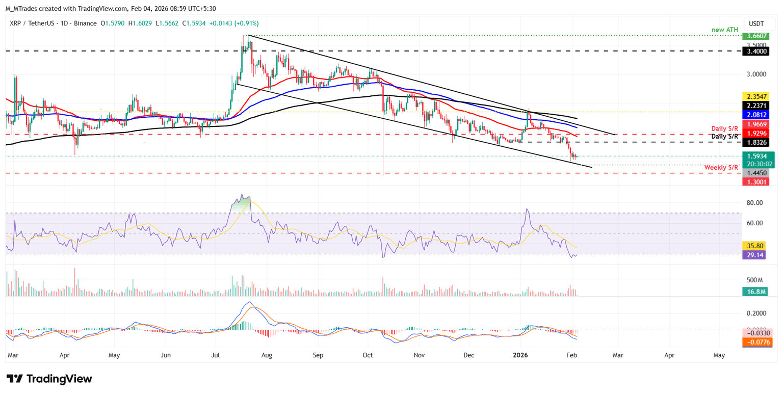 上周XRP价格收于1.83美元的日线支撑位下方,本周至今一直在1.44美元附近的下降楔形形态下边界附近徘徊。截至周三发稿时,XRP交易价格为1.59美元。