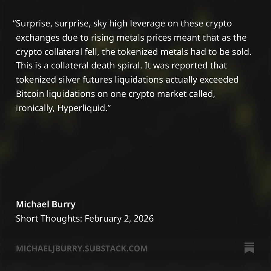 Burry补充道:“据报道,在一个名为Hyperliquid的加密货币市场上,代币化白银期货的清算量实际上超过了比特币的清算量,这真是莫大的讽刺。”