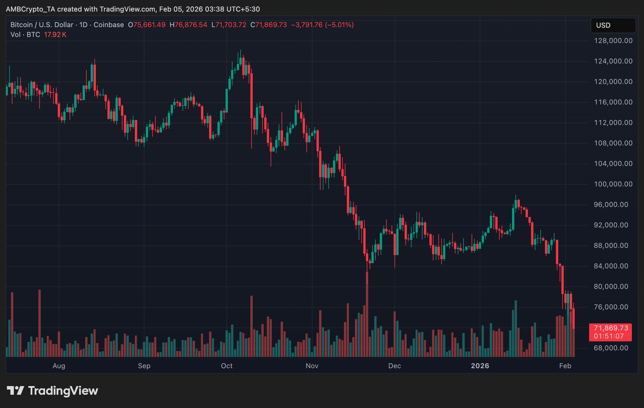 截至发稿时,比特币的交易价格约为71,800 美元大约下降5%当天,在短暂跌至日内低点附近71,700 美元根据 TradingView 的数据。