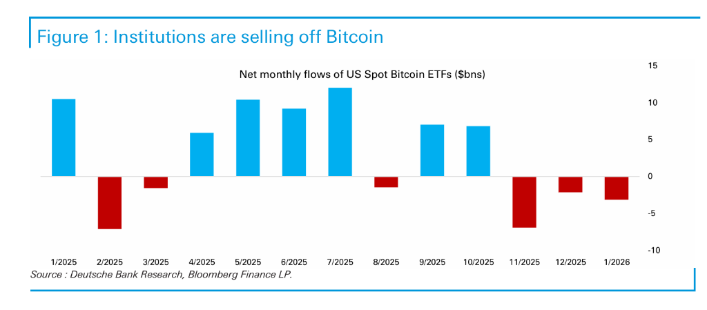 美国现货比特币ETF遭遇大规模赎回,成为价格承压的核心因素。据德银数据,这些基金在2026年1月、2025年12月和11月分别录得超30亿美元、约20亿美元和约70亿美元的资金外流。