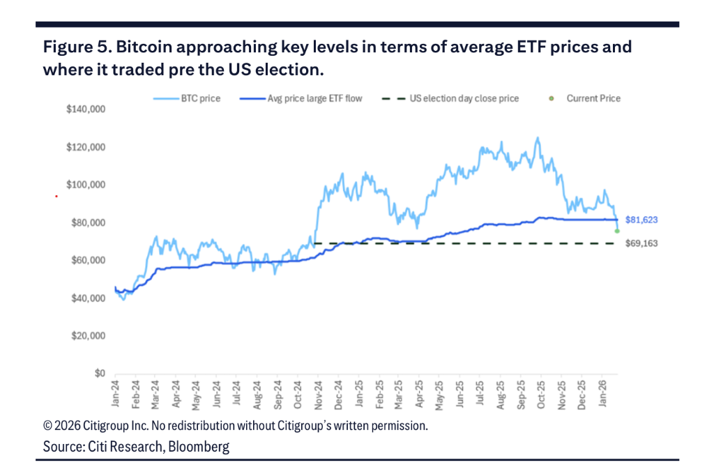 比特币正在测试两个被市场密切关注的技术水平。花旗研究指出,第一个是ETF平均入场价格81600美元——以最大ETF每日收盘价计算的平均水平。比特币目前已跌破该水平,意味着平均持有者已处于亏损状态。