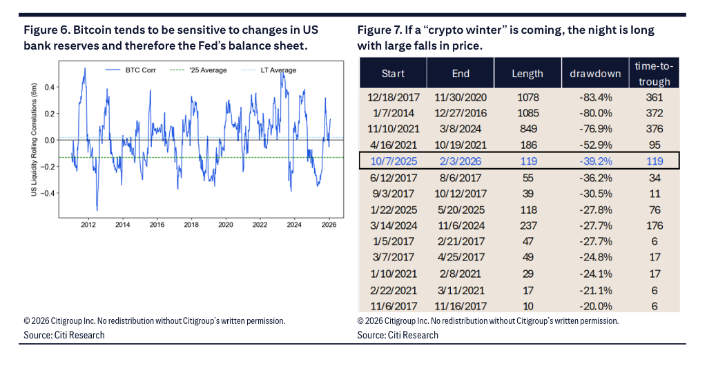 比特币对美国银行流动性高度敏感,沃什领导下的美联储可能缩减资产负债表,这为市场增添了额外担忧。花旗研究显示,比特币往往对美国银行准备金的变化非常敏感,因此对美联储资产负债表的变化也很敏感。