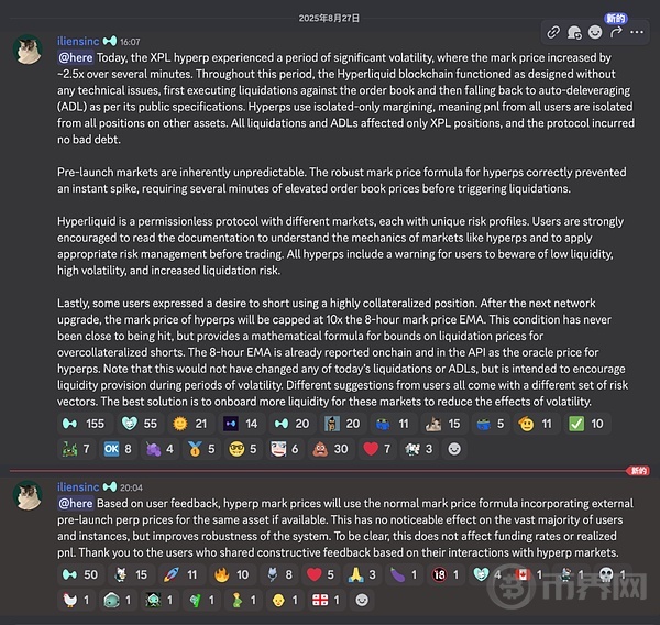如果是币安等 CEX,巨鲸早就被人工封禁,连下单狙击的可能性都微乎其微,事后,Hyperliquid 团队在 Discord 的回复是,深刻理解,吸取教训,坚决改进,暂不赔偿。