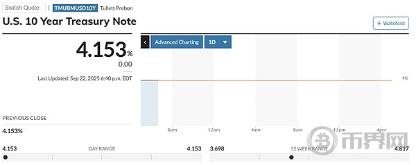 若此态势持续,可能压制加密市场贝塔表现。据MarketWatch十年期国债页面显示,十年期收益率维持在4.1%附近,美元指数与谨慎的股指期货同步走强。