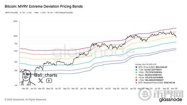 最后,分析师根据MVRV的几条标准差曲线指出,在均值$98,650下面的支撑位可能有:-0.5个标准差的$75,740;-1个标准差的52,820。