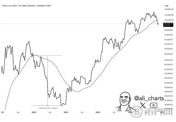 分析师指出,BTC有效跌破了50周均线(其实就是大致相当于年均线,因为50乘以7等于350接近于一年365天),上次有效跌破还是2022年,直接开启了熊市。