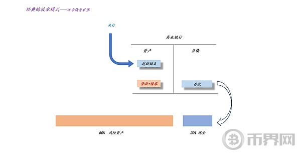 如上图所示,在这种体系下,一方面,央行扩张超额准备金;另一方面,商业银行扩张信用,贷款和债券等法币债务规模膨胀。最终,我们会观察到存款的扩张,以及风险资产价格的膨胀(ps:假设风险偏好维持不变,即居民意愿的现金/风险资产比率)。