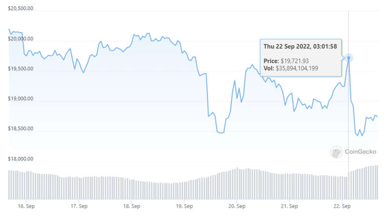 尽管这一决定符合预期,但这一消息一如既往地在市场上引起了轩然大波。比特币在公告发布后一小时内上涨至 19,700 美元,随后又跌回 18,500 美元。另一方面,ETH 受到的打击更大,下跌超过 10.6%,跌至 1,230 美元的最低点。