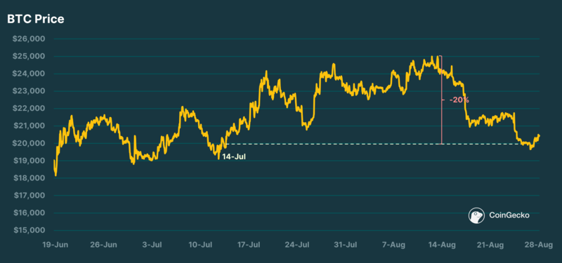 自 7 月 14 日以来,BTC 价格首次跌破 20,000 美元。与两周前的 8 月 15 日约 25,000 美元的最高价相比,这已下跌约 20%。