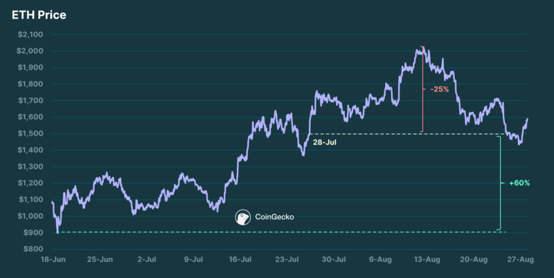 ETH 相对于 BTC 跌幅更大,目前交易价格低于 1.5 万美元,较近期约 2,000 美元的高点下跌约 25%。但从 6 月中旬约 900 美元的低点来看,显然仍上涨了 60% 以上。