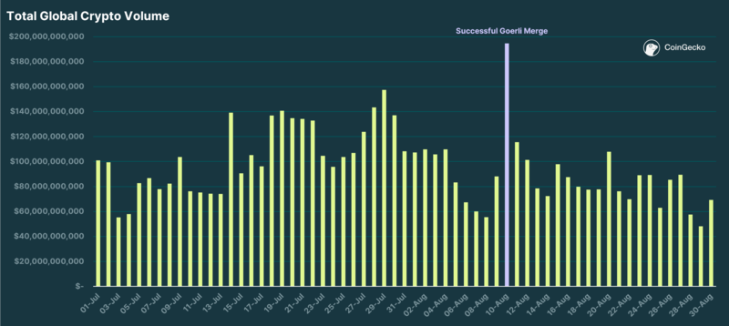 自 Goerli 合并以来,交易量在 7 月中旬至 8 月中旬的繁荣之后大幅下降。8 月 29 日,交易量甚至跌破 500 亿美元,上一次出现这种情况是在 2022 年 6 月 5 日,而之前是 2020 年 11 月 16 日。