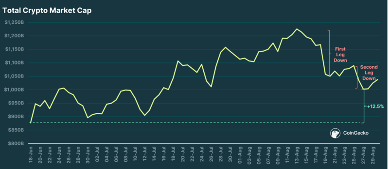 下跌真正开始于两周前的 8 月 16 日,当时人们对美国 7 月份 CPI 数据的乐观情绪消退。总市值从 1.2 万亿美元下跌至约 1 万亿美元,然后在上周末再次恶化。